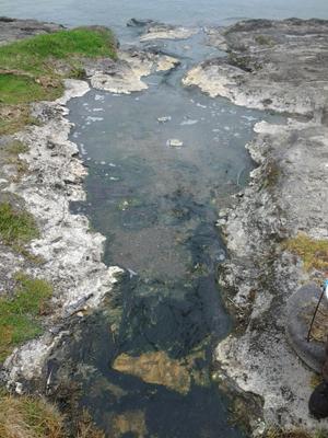 Onekeneke Stream just before it flows into Lake Taupo. Sample taken on south side of bridge on the paved walk on the lake shore. Green biomass growing in bed of stream and short grass on both edges.