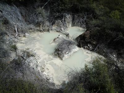 Looks very like Parariki Spring at Rotokawa. Lots of pock marks in yellow sediment on base of spring. Looks hotter in certain areas that can't safely reach. Small run off into spring downstream. Island of sediment in middle.